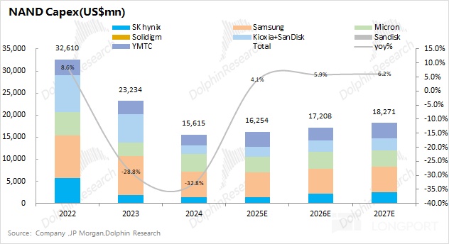然而存儲廠商的資本開支更多地投向於 DRAM 領域,而非 NAND。根據當前各家廠商預期及行業面情況,全球 NAND 資本開支至 2027 年將回升至 183 億美元,兩年的複合增速僅 6% 左右。