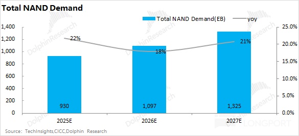 在此基礎上,2026 年和 2027 年的 NAND 供應量有望達到 1041EB 和 1246EB(相當於 1x10^12GB),複合增速為 18% 左右。