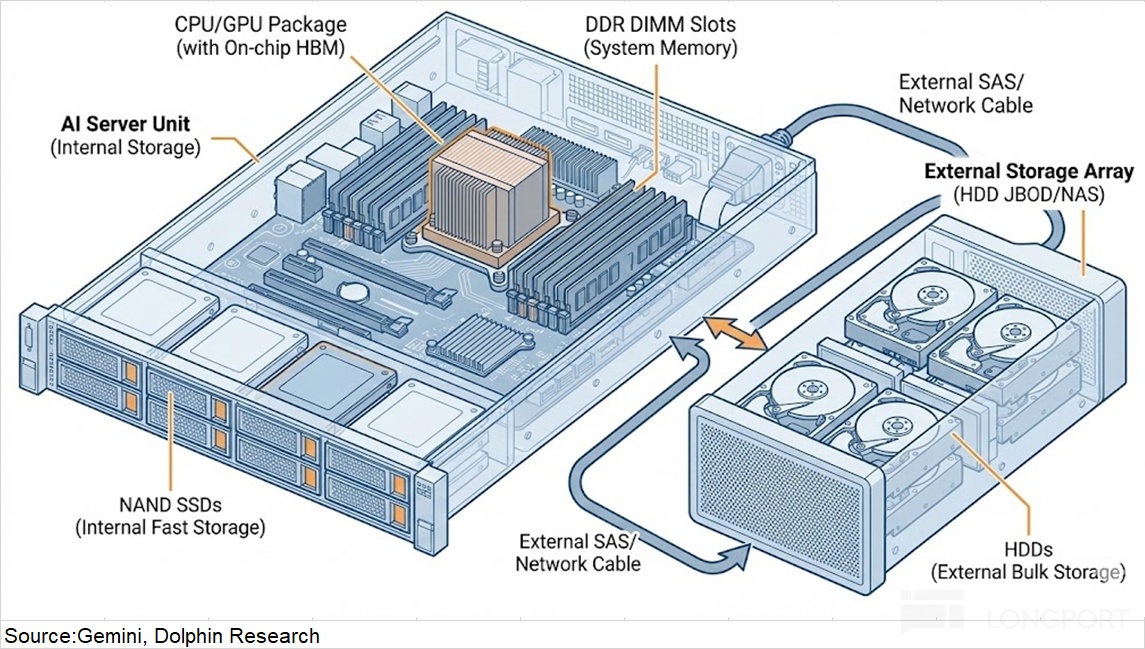 在 AI 服務器內部,HDD 並非必需品,隨着 AI 存儲需求持續增加,HDD 才獲得了市場的關注。這裏可以分為 AI 服務器(計算節點)和 AI 數據中心(存儲節點)兩部分看: