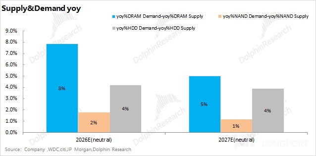a)“供不應求” 要拉到 2027:在 2026-2027 年間,市場對 DRAM(含 HBM 和 DDR)、NAND(固態硬盤) 和 HDD(機械硬盤)的需求量增長都將快於供應量增速,存儲供需情況持續緊張;