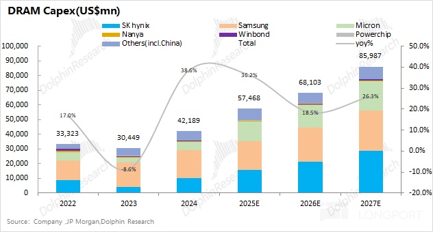 而供需兩端的絕對量來看,海豚君認為 DRAM 的供需局面將在 2026 年和 2027 年將更為緊張。