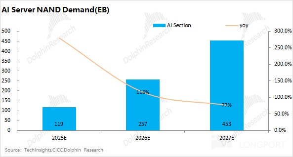 以類似的方式來預估 2027 年的需求量情況,可以估算出 AI 服務器對 NAND 的需求量在 2026 年和 2027 年分別為 258EB 和 453EB,同比增長 116% 和 77%。