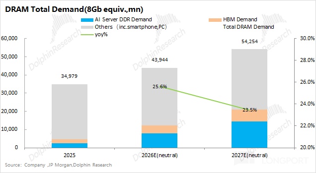 在以上假定的情況下,再結合 AI 服務器中對 HBM 和 DDR 的需求量,可以估算出 2026 年和 2027 年對 DRAM 市場的整體需求量為 439 億 GB 和 542 億 GB,同比增長 25% 和 23%。