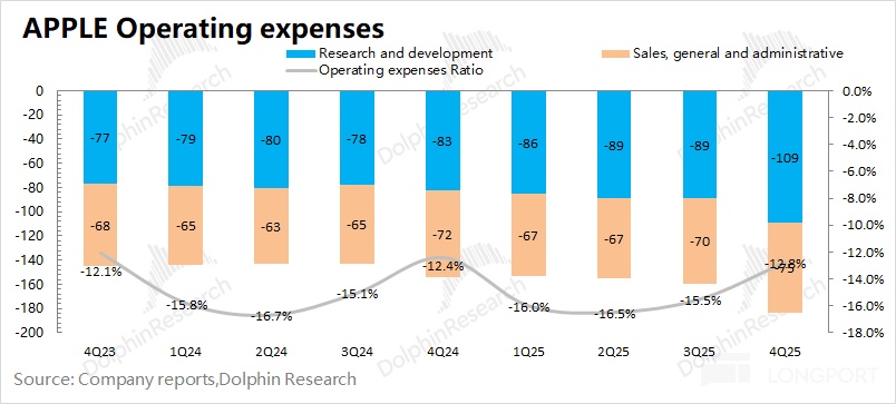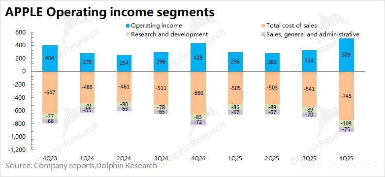1.3 經營利潤:2026 財年第一季度(即 4Q25)蘋果公司經營利潤 509 億美元,同比增長 18.7%。蘋果公司本季度經營利潤的增長,是受收入增長和毛利率提升的共同帶動。