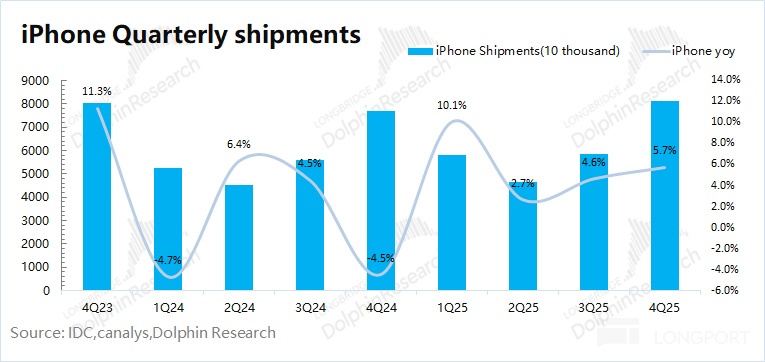 1)iPhone 出貨量:根據 IDC 的數據,2025 年第四季度全球智能手機市場同比增長 1.4%。蘋果本季度全球出貨量同比增長 5.7% 左右,公司的出貨量表現好於整體市場。