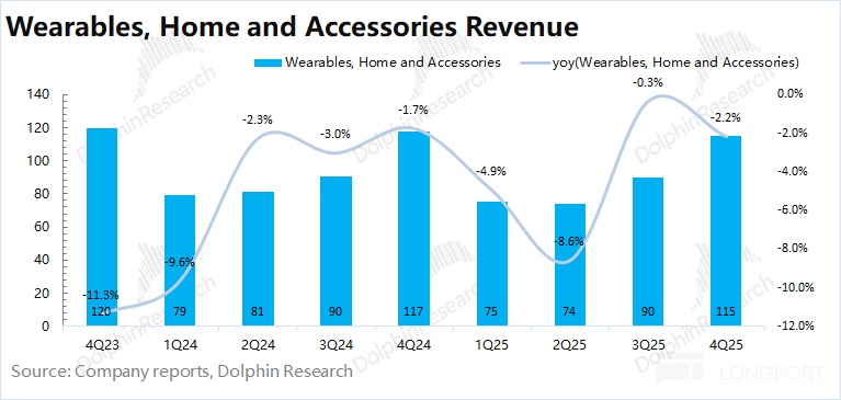 2026 財年第一季度(即 4Q25)可穿戴等其他硬件業務收入 115 億美元,同比下滑 2.2%,不及市場預期(121 億美元),本季度依然低迷。