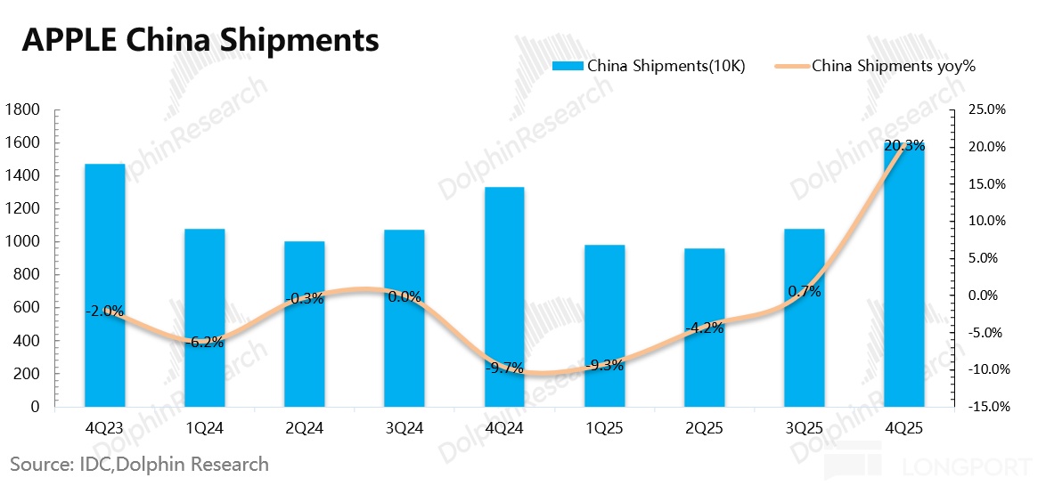 iPhone17 系列將存儲統一升級至 256G 起步,但價格依然維持在 5999 元(符合中國大陸國補要求),這直接帶動了 iPhone 在本季度中國大陸地區的出貨量實現了將近 20% 的增長,遠好於整體手機市場的表現(同比-0.8%)。