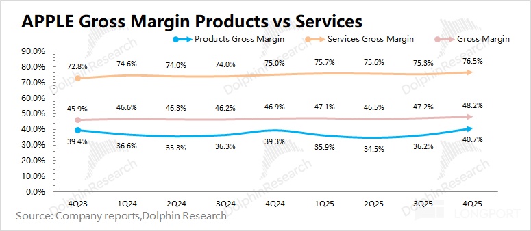 ①收入端增長:主要來源於 iPhone17 系列的帶動。其中本季度 iPhone 增長 23%,雖然 iPhone17 系列創新不多,但 “加量不加價” 的策略取得不錯的效果。尤其是 iPhone17 256G 也能享受國補的政策,中國大陸地區銷量實現大幅提升;