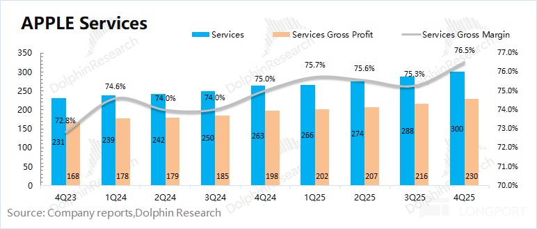 4、軟件服務:公司軟件服務本季度收入達到 300 億美元,符合市場預期(300 億美元)。憑藉 76.5% 的高毛利率,公司軟件業務以 21% 的收入佔比,產生了公司 33% 的毛利潤。