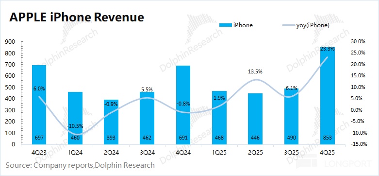 2026 財年第一季度(即 4Q25)iPhone 業務收入 853 億美元,同比增長 23%,好於市場預期(782 億美元)。公司 iPhone 業務本季度的增長,主要得益於 iPhone17 系列新品以及美元貶值的帶動。
