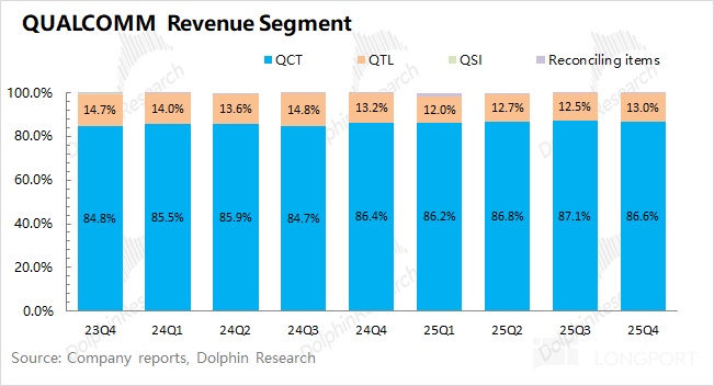 對於公司本季度手機業務增速回落,海豚君認為主要有兩個原因:①公司將旗艦產品驍龍 8 Elite Gen5 發佈提前至上個季度;②整體手機市場的行業面低迷表現。
