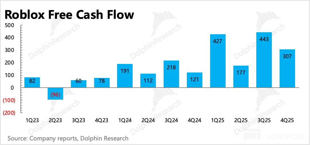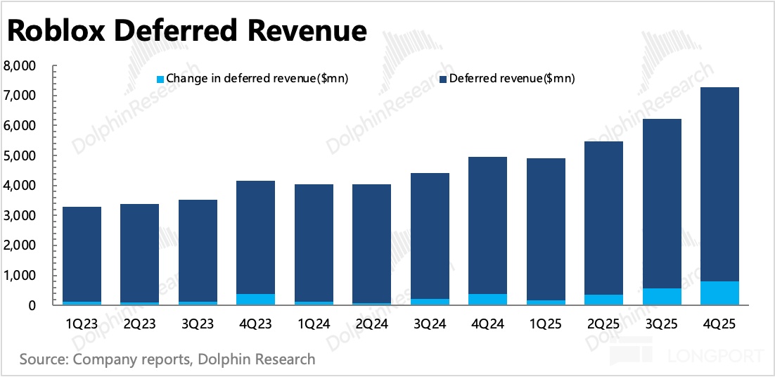 否則就會因為遞延週期太長(非一次性消耗的虛擬商品,一般按照用户平均生命週期 27 個月來進行遞延確認)、收支週期錯配(收入遞延,但是付給開發者的分成費用不遞延)而產生差異,而低估了其商業模式下的現金流優勢——截至 2025 年末,年收入不足 70 億、看似長年鉅虧的 Roblox,已經積累了近 45 億的淨現金。