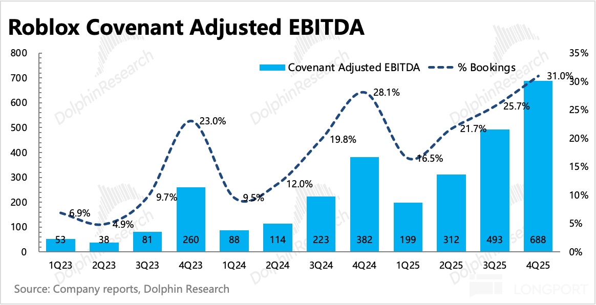 最終計算得 Covenant Adj. EBITDA 四季度為 6.9 億,佔 Bookings 比例為 31%,達歷史新高。不過由於前文所説的提高開發者分成、基建費用、信任與安全費用等支出,公司指引 2026 年該利潤為 20~21.7 億,利潤率相比 2025 年要下降不到 1pct。