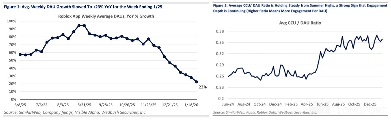 這恰如我們此前所説,對 Roblox 的閉環生態長期看好,但短期仍存在好公司與好估值矛盾的問題。而當 Genie 造成的遊戲股亂殺之後(至於 Genie 影響,可回顧海豚君的點評《血洗遊戲股,谷歌打出 “滅霸響指”》),從中期視角看,海豚君認為此時的估值(昨日收盤 425 億市值對應 26 年業績 18x EV/Convenant Adj.EBITDA,鑑於管理層一貫保守,我們將預期按指引提高 10%)已經回落到可以吸引一些耐心資金開始有興趣關注的時候。
