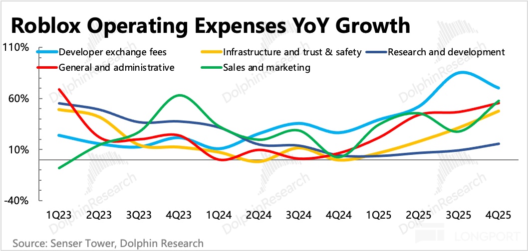 主要提高的還是開發者分成,佔到了總運營支出的 27%,也佔到了總收入的 34%;其次是基礎設施和信任安全方面投入,為了支撐 1.44 億用户每天 2 個多小時的順暢體驗,需要同步擴容服務器,保證運行穩定。