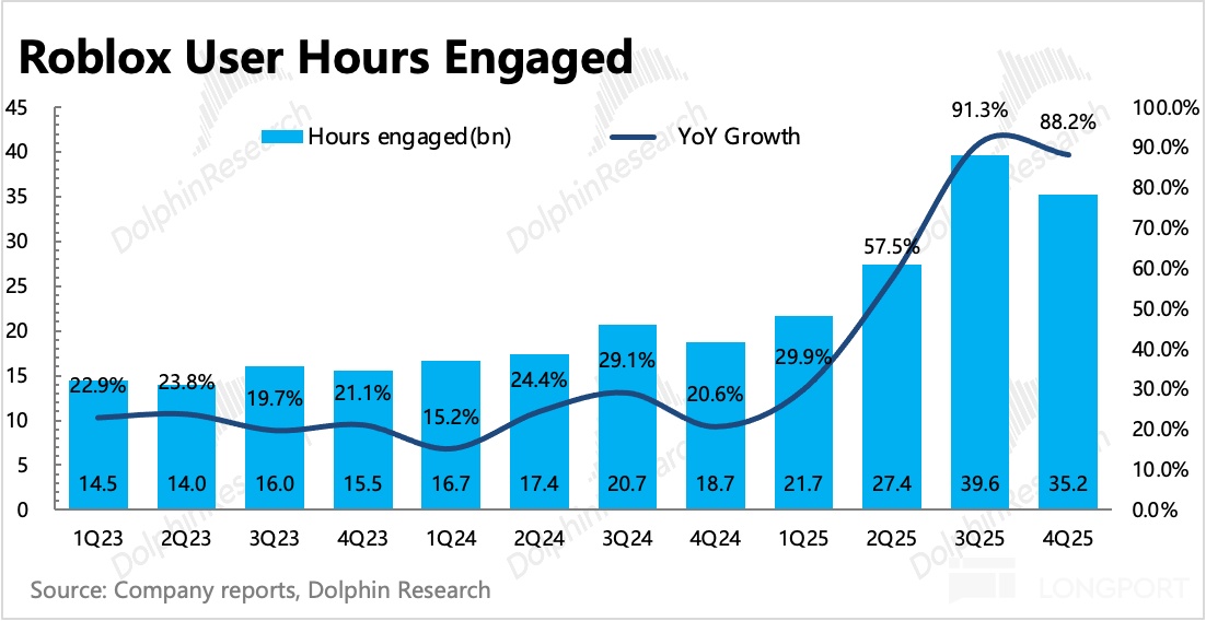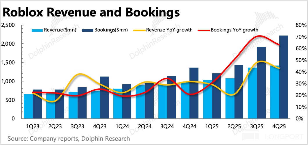 對 Roblox 來説,流水比收入更具備前瞻性,因此也就更值得關注,這次 Q4 以及對今年 Q1 的指引均超預期。此前市場擔心今年的高基數壓力,預期流水增速要低於一直以來的中長期指引 20%。