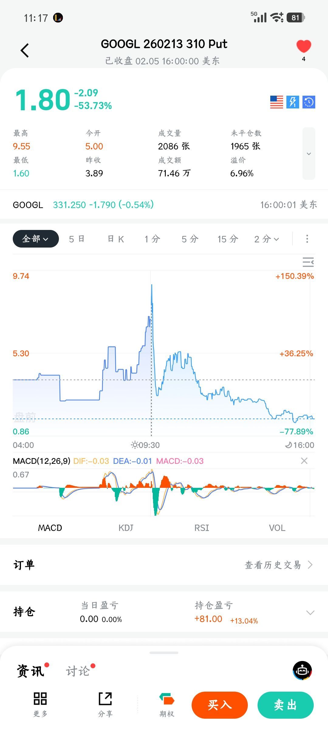 昨天又是驚魂一夜,$谷歌-A(GOOGL.US) 期權 sell put,股價一度到了行權價又硬生生地拉了上去,先是漲了 150% 收盤又跌回 50%,等於是先虧損 150% 後來又盈利 50%,做期權必須要有一顆大心臟啊,要不然很容易被擠爆。