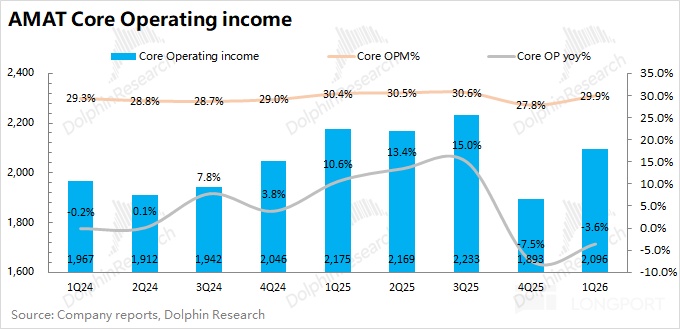 應用材料 AMAT 本季度核心經營利潤為 21 億美元,同比下滑 3.6%,核心經營利潤率為 29.9%。利潤端增加,主要是受毛利率回升的帶動。