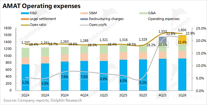 應用材料 AMAT 在 2026 財年第一季度的經營費用為 16 億美元,同比增長 21%。