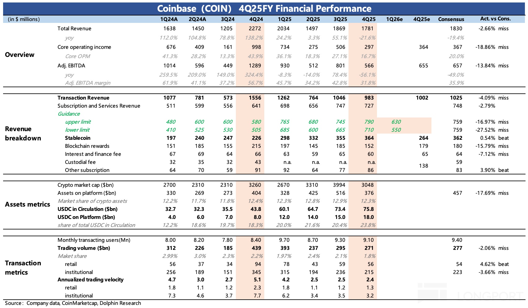 以下為海豚君整理的$Coinbase(COIN.US) FY25 Q4 的財報電話會紀要,財報解讀請移步《爛行情 + 爛業績,Coinbase 何時見 “底”?》
