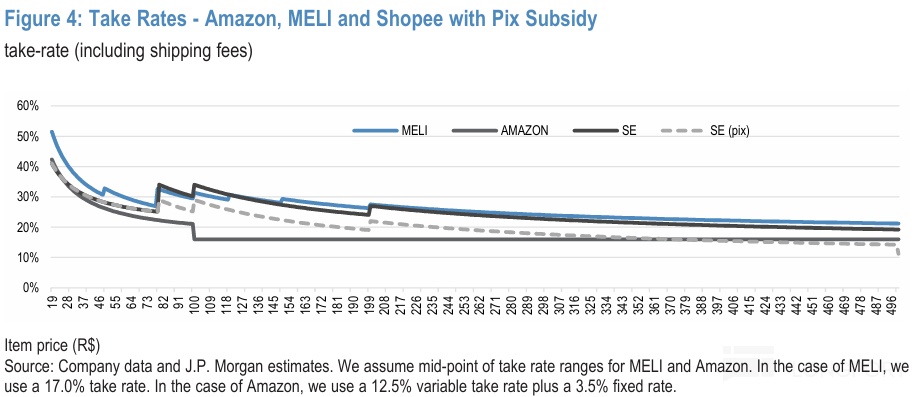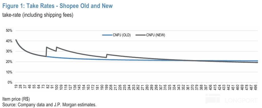 主要變化是,市佔率第二的 Shopee 近期在巴西市場連續調高了變現率,包括:a. 對個人賣家收取的每單服務費從 R$5 上調到 R$7(40% 的調升); b. 對企業賣家的佣金曲線也做出調整,由下圖可見主要變化是拉昇了 R$80~ R$300 這一價格區間內商品的佣金率。