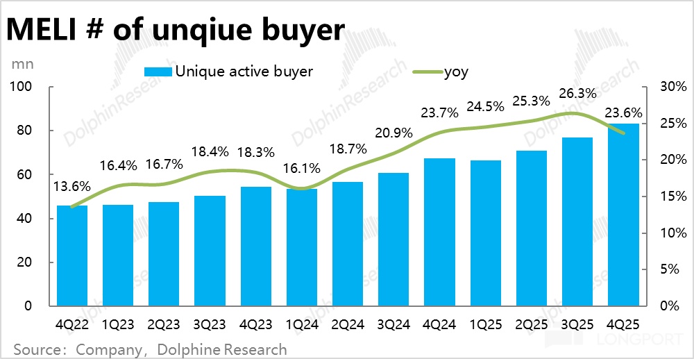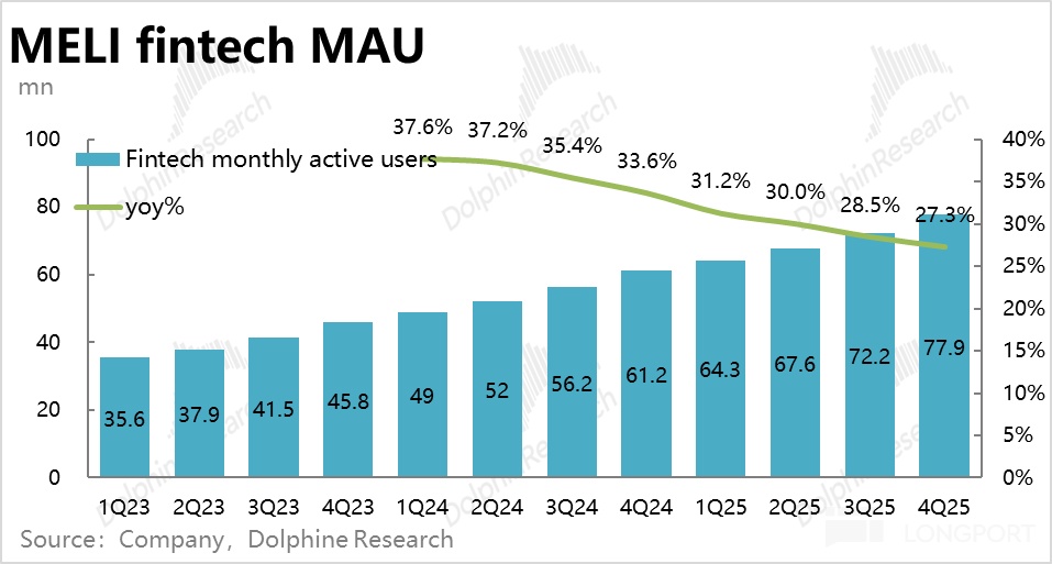 Meli 金融板塊的第一指標,金融月度活躍數量本季達 7790 萬人,環比淨增 570 萬,是統計以來的單季淨增最高值。金融板塊客羣拓展同樣不錯。