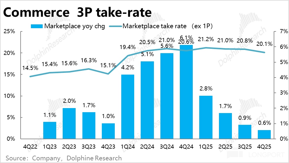 而3P 平台收入(service)則同比增長約 32%,測算出的電商 3P 平台變現率為 20.1%,環比季節性走低,同比提升幅度進一步走低至僅 0.6pct,再創新低。體現瞭如降低免郵門檻等舉措,通過將利潤空間讓渡給商家或消費者以促進增長,搶奪市佔率的態度。