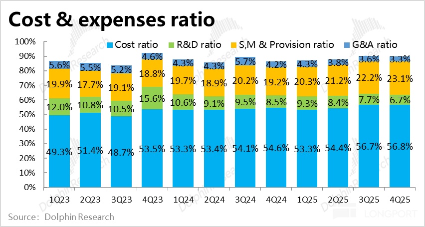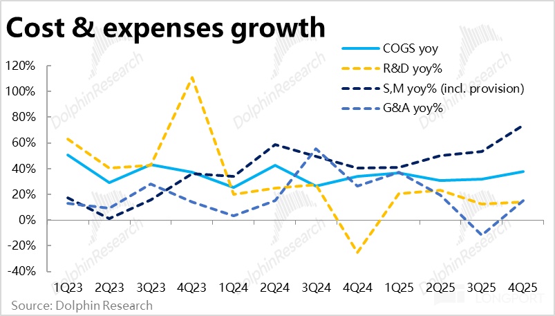 從成本和費用角度,本季的毛利率為 43.2%,同比收窄了超 2pct。雖然公司不披露各個板塊毛利率細節,但結合上文的分析,電商板塊的免郵門檻下調、支付業務和信貸業務同比角度的變現率也都在走低。毛利率下滑並不意外。