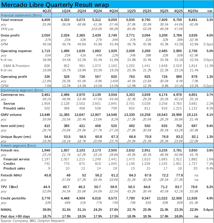 由於電商業務和信貸業務都增長不俗,本季 Meli 整體營收同比增長了近 45% 到 87.6 億,環比有不小提速,且高於彭博一致預期約 3pct。增長端的表現可以説不錯。