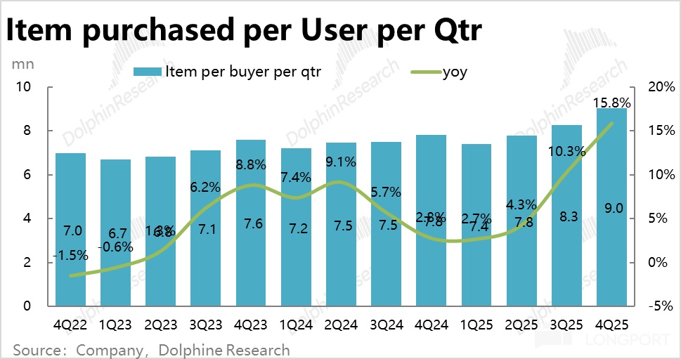 更進一步看,本季人均下單量本季達到 9 次,同比大幅提升了 16%,是增長加速的最本質原因,更清晰的體現了免郵門檻下降後,用户下單意願的上升。