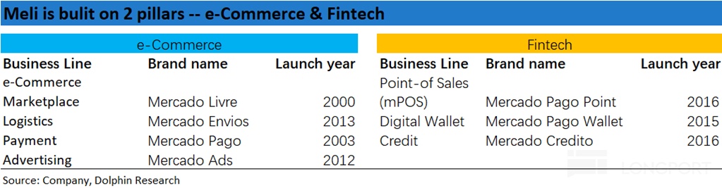 MercadoLibre 作為拉美地區最大的互聯網公司之一,旗下擁有電商和金融支付兩大板塊。以下我們按公司在財報中的披露口徑,梳理下公司的主要業務構成,以便更好地理解公司的概況和下文的分析: