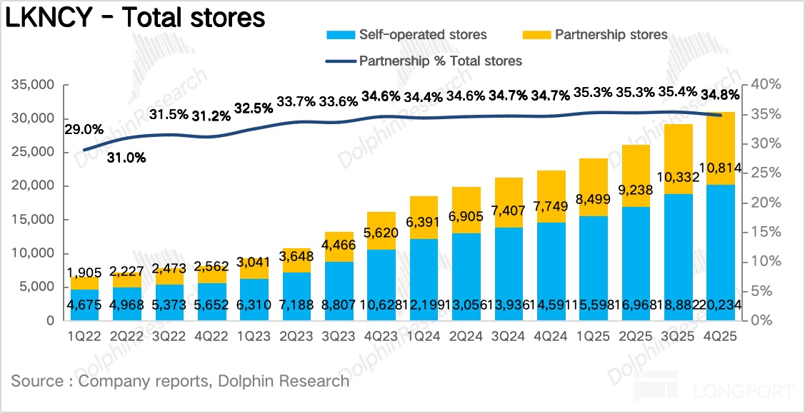 雖然減少了用户端的補貼,另一個值得注意的動作在於Q4 瑞幸加大了對加盟門店(尤其是杯量偏低)的補貼,海豚君認為,這裏一方面是由於 2025 年瑞幸經歷了在下沉市場大規模開設加盟門店搶佔市場,而這些加盟商即將迎來第一個淡季(一季度),可以幫加盟商平穩過渡,另外,也反映出儘管瑞幸當前邁入了 3 萬家俱樂部,公司仍然認為通過加盟門店在下沉地區搶佔市場的必要性。