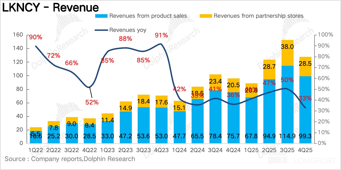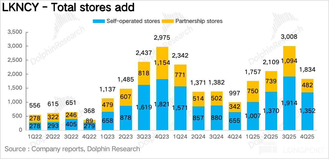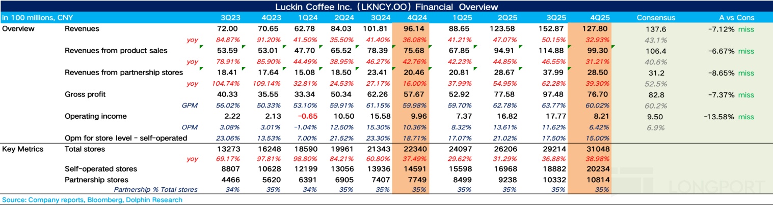 Q4 瑞幸實現總營收 127.8 億元,同比增長 32.9%,不及預期。拆分業務來看,自營門店實現營收 99 億元,同比增長 31.2%,加盟業務收入 28.5 億元,同比增長 39.3%,增速快於自營門店的增長,核心還是在於 2025 年瑞幸系統性降低了加盟門檻,通過加盟模式加速下沉搶佔點位。