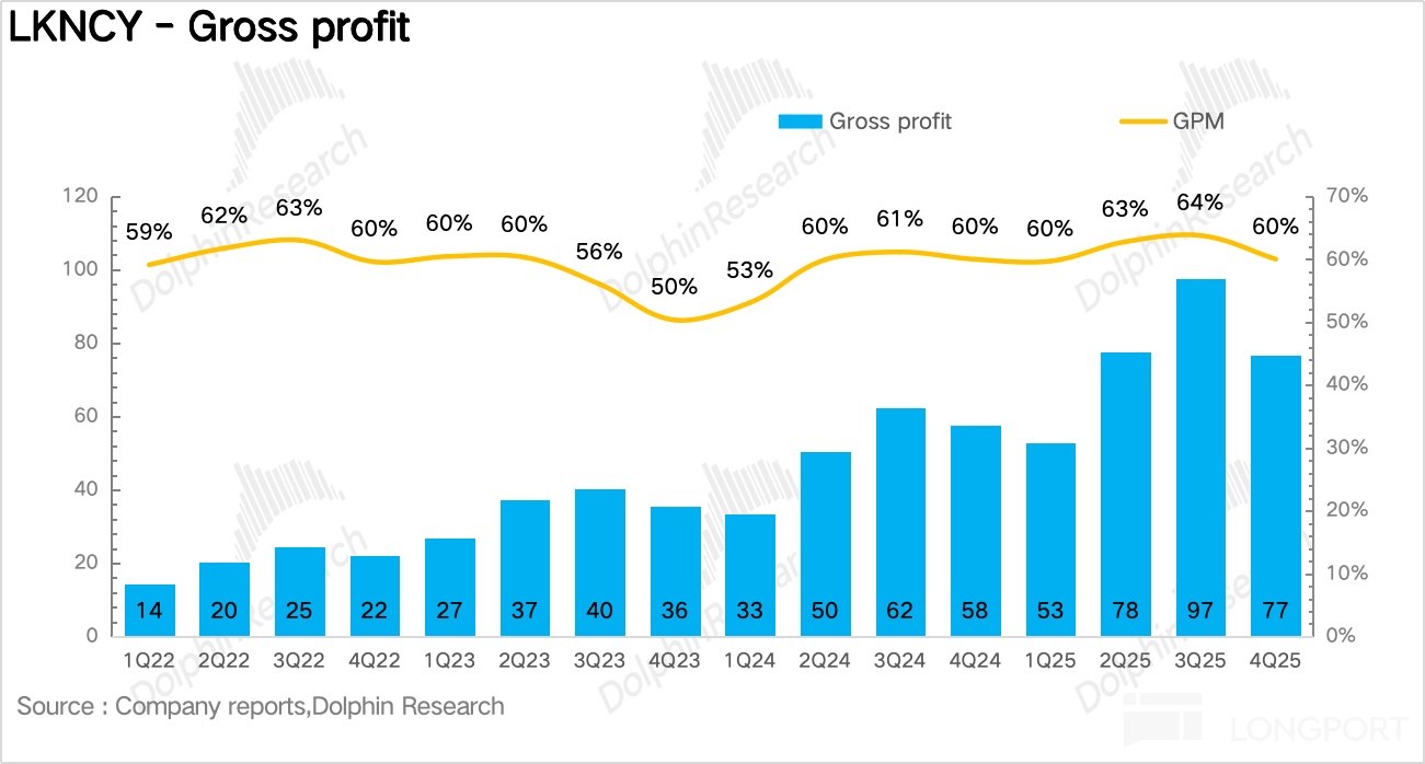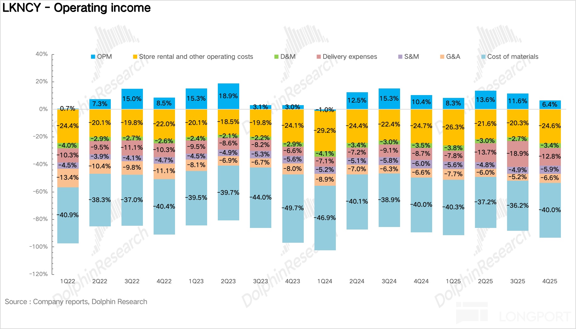 Q4 毛利率整體保持平穩,費用端拆分看,四季度公司的配送費用達到 16.3 億元,同比增長 94%,佔營收的比重從去年同期 8.7% 大幅拉昇到 12.8%,仍然是利潤端最大的拖累項。但從中期來看,由於外賣補貼並不可持續,因此對於瑞幸來説,本季度飆升的配送費用實際上也只是短期影響,後續伴隨自提比例的提升,配送費用率大概率還是會回落至 10% 以下的常態化水平。