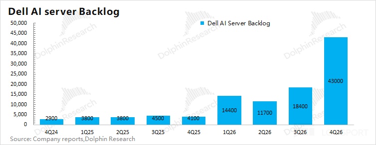 在傳統業務承壓 “難以避免” 的情況下,公司最大的看點就是 AI 業務。公司本季度給出了 341 億美元的 AI 服務器新增訂單,大幅好於市場預期(110 億美元)。本季度末公司積壓訂單達到 430 億美元,這為公司 AI 業務高增長奠定了基礎。