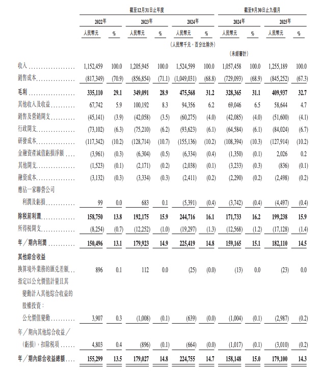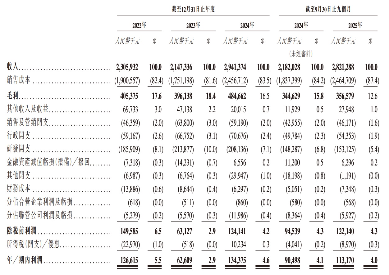 財務方面,從收入結構來看,定制化產品及解決方案為主要收入來源,2025 年前三季收入佔比達 90.5%;智能模組及解決方案收入增長顯著,2025 年前三季度收入 18.65 億元(單位人民幣,下同),佔總營收 66.1%(其中高算力智能模組及解決方案佔總收入比重為 34.2%)。從整體收入情況來看,2022 年至 2024 年及 2025 年前三季度,其營收分別為 23.06 億元、21.47 億元、29.41 億元及 28.21 億元;同期淨利潤分別為 1.27 億元、6260.9 萬元,1.34 億元及 1.13 億元。