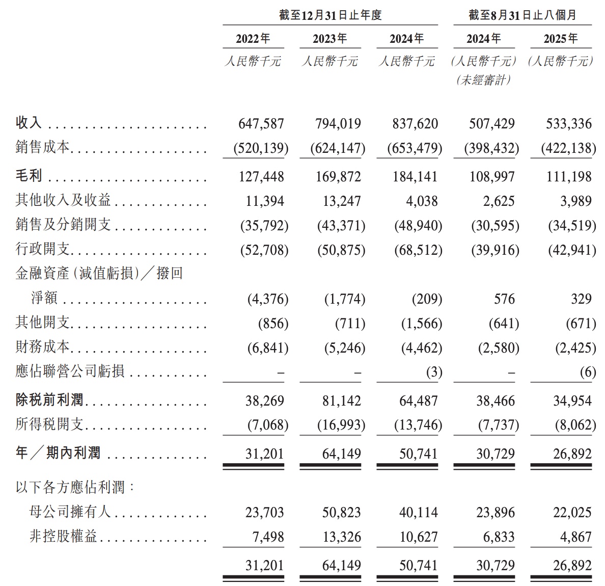 財務方面,公司的整體業績表現穩中有進,於 2022 年 - 2024 年,兆威機電的收入由 11.52 億元提升至 15.25 億元,同期年度利潤由 1.5 億元增長至 2.25 億元,收入及淨利潤均持續提升。2025 年前三季,公司收入和期內利潤分別為 12.55 億元及 1.82 億元,同比均錄得增長。