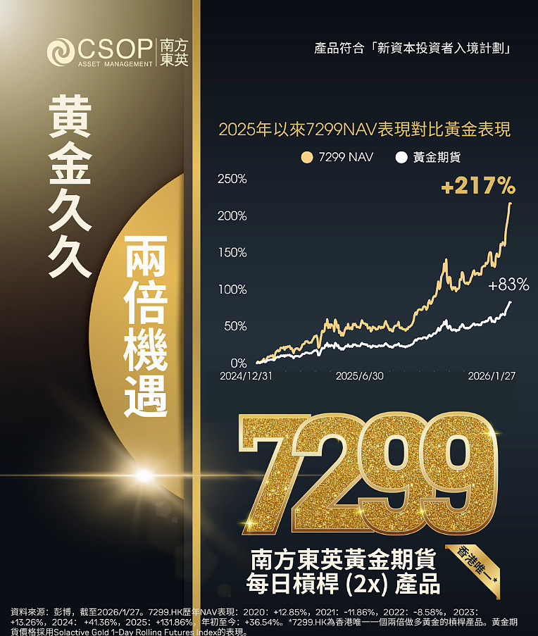 當前地緣風險並未消散,資金可能持續流向黃金尋求避險,這或許意味着黃金仍有廣闊的上漲空間。投資者可以關注$南方兩倍看多黃金 (07299.HK) ,追趕漲勢。