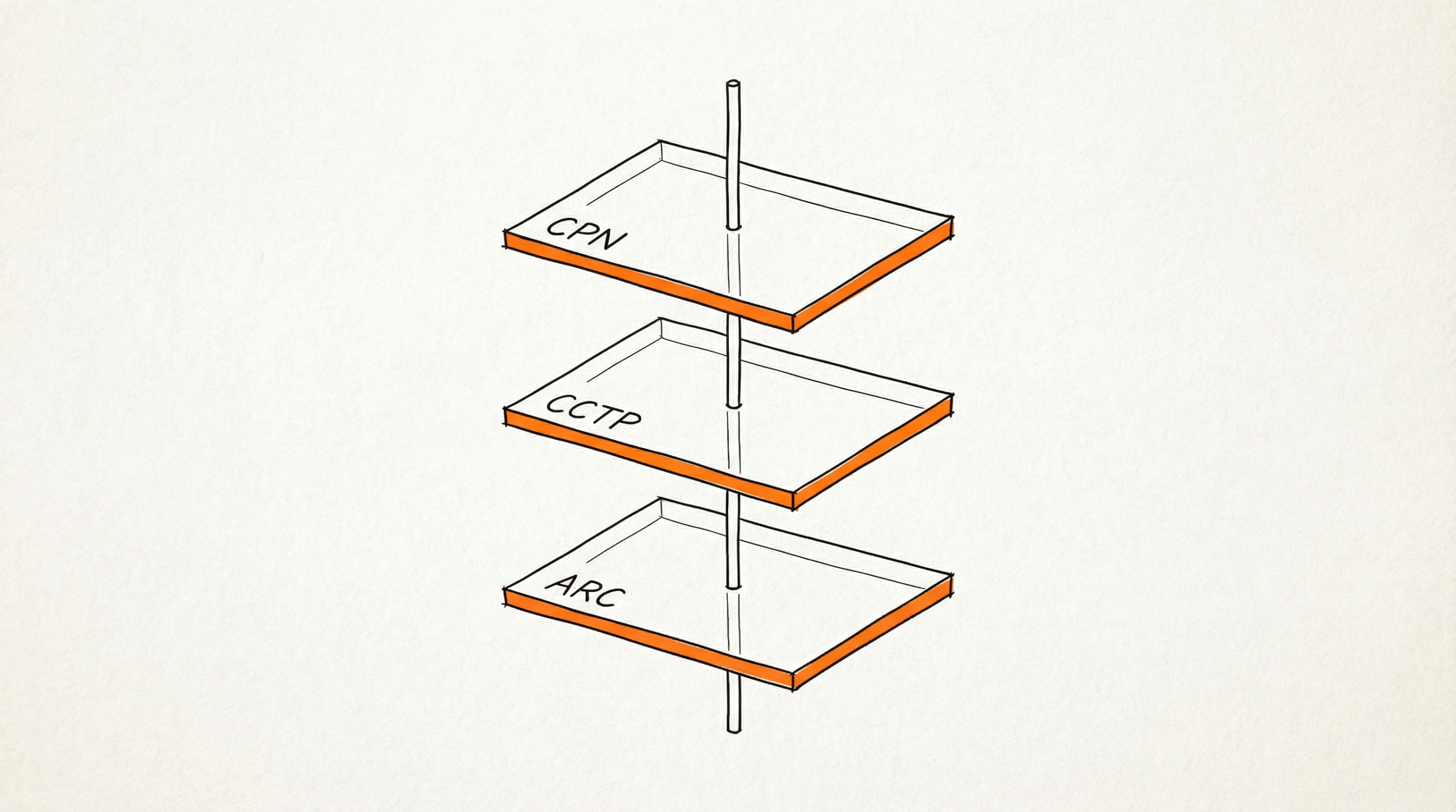 中間層 CCTP:跨鏈傳輸協議,已在超過 30 條鏈上原生髮行 USDC。2026 年 1 月,CCTP 佔全網跨鏈資產橋接量的 62%——不只是 USDC,是所有資產。