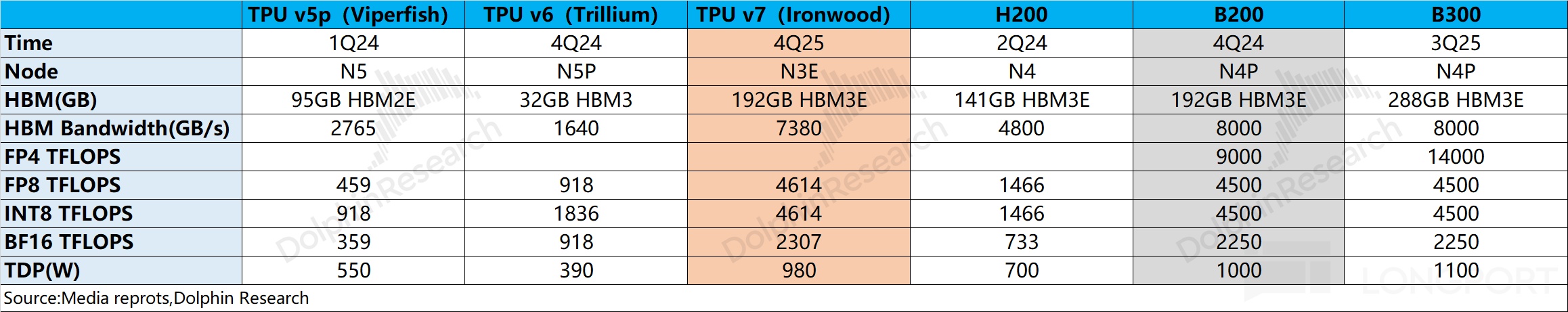 當前 TPUv7 已經開啓量產出貨,對比英偉達的 GPU 來看,TPUv7 在 FP8 等領域的表現大致已經接近於英偉達的 B200(2024 年四季度量產),谷歌 TPU 大致落後於英偉達一年左右。