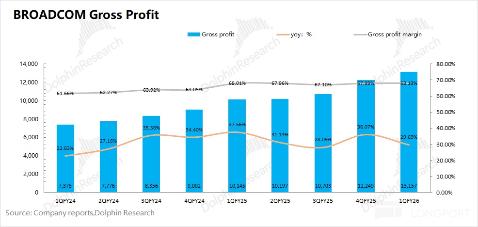 博通 BROADCOM (AVGO.O) 在 2026 財年第一季度實現毛利 132 億美元,同比增長 30%。其中博通在本季度的毛利率為 68.1%,環比略有提升。