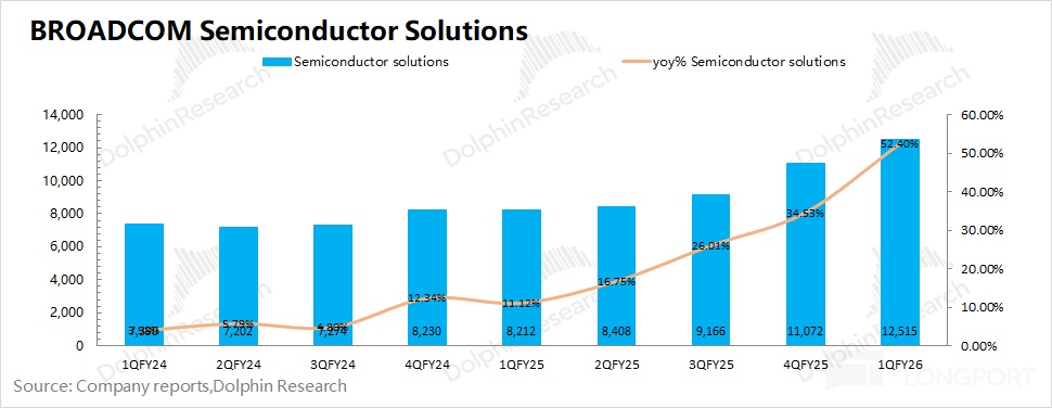博通 BROADCOM (AVGO.O) 在 2026 財年第一季度的半導體解決方案實現營收 125 億美元,同比增長 52%。公司半導體業務本季度的增長主要來自於 AI 業務的帶動,非 AI 業務保持平穩。