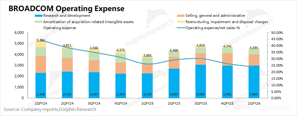 博通 BROADCOM (AVGO.O) 在 2026 財年第一季度的經營費用為 46 億美元,環比略有回落。