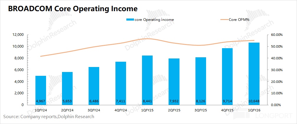 相比於淨利潤,海豚君認為核心經營利潤(=毛利潤 - 研發費用 - 銷售及管理費用)更能反應公司真實的經營情況。博通 AVGO 本季度實現核心經營利潤 106.5 億美元,環比增加 9 億美元,主要來自於 AI 業務增長的帶動。