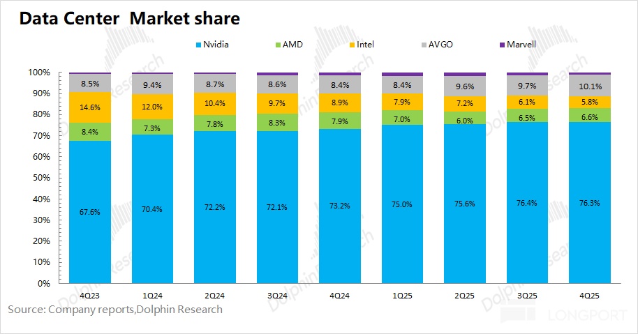 b)AI 芯片份額:在 AI 芯片市場中,英偉達仍處於絕對領先的位置,博通 AVGO 扮演者 “追趕者” 的角色。