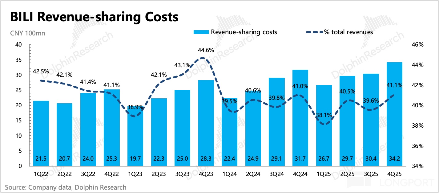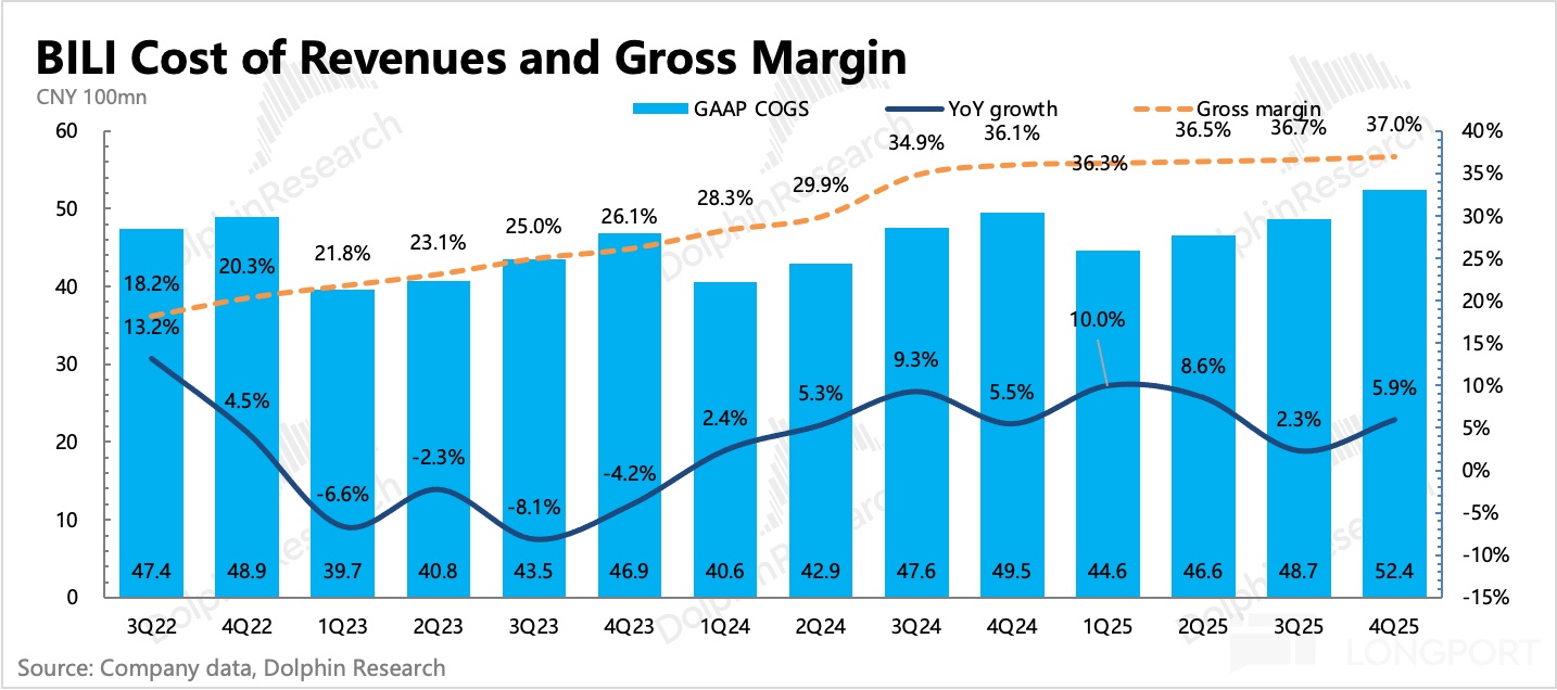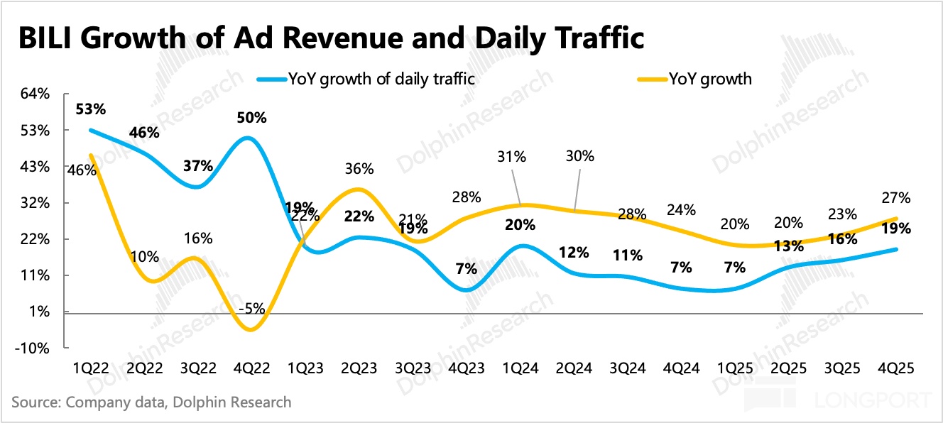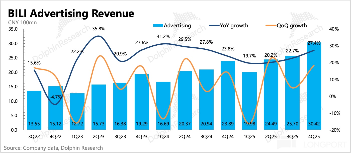 1. 廣告高增長,趨勢有望繼續:Q4 廣告增長 27%,小幅超出市場預期。海豚君認為,背後驅動除了本身生態在良性增長外(用户、up 主內容創作均在正常增長),也有公司主觀的努力(提高廣告加載率、改善廣告效率、AIGC 廣告生成工具等),和環境順風(短劇、小遊戲、AI 等內容產品,天然適配 B 站平台用户標籤)。