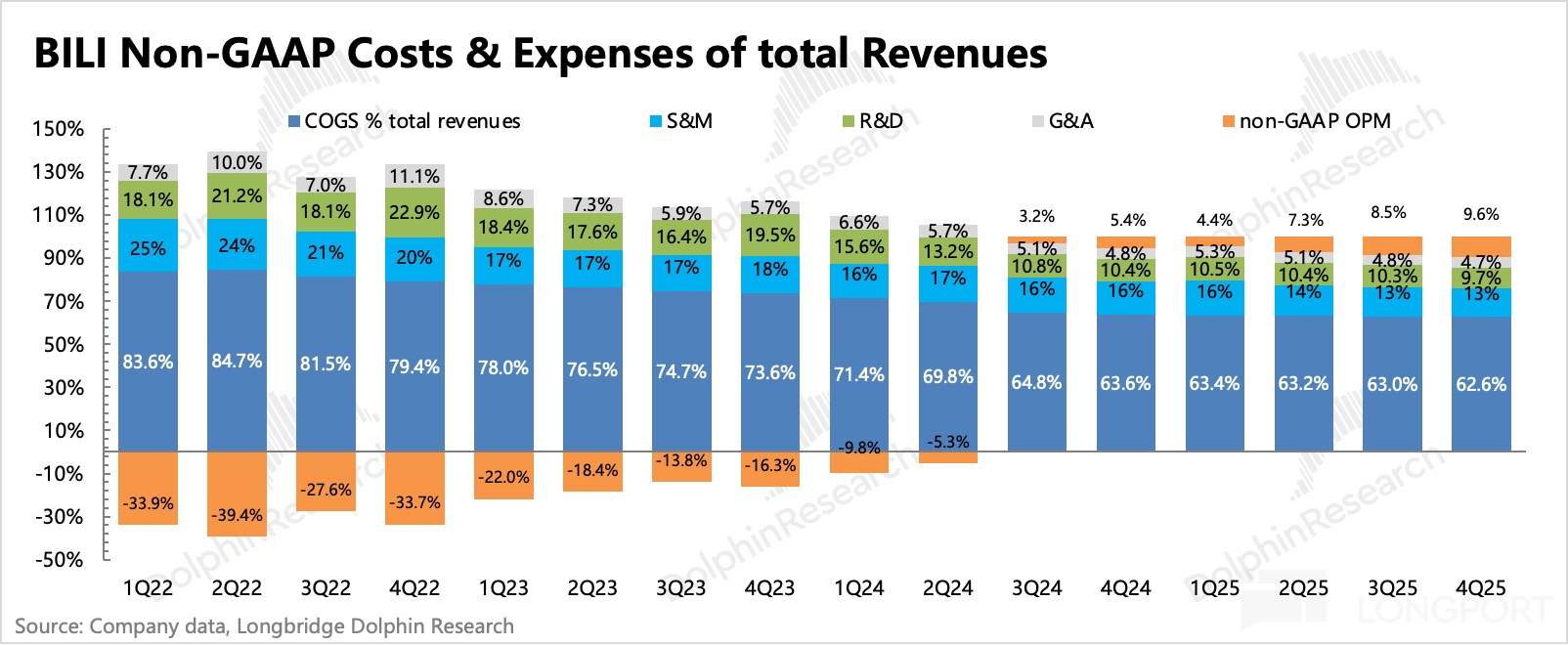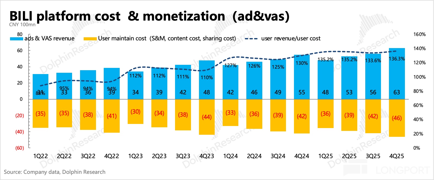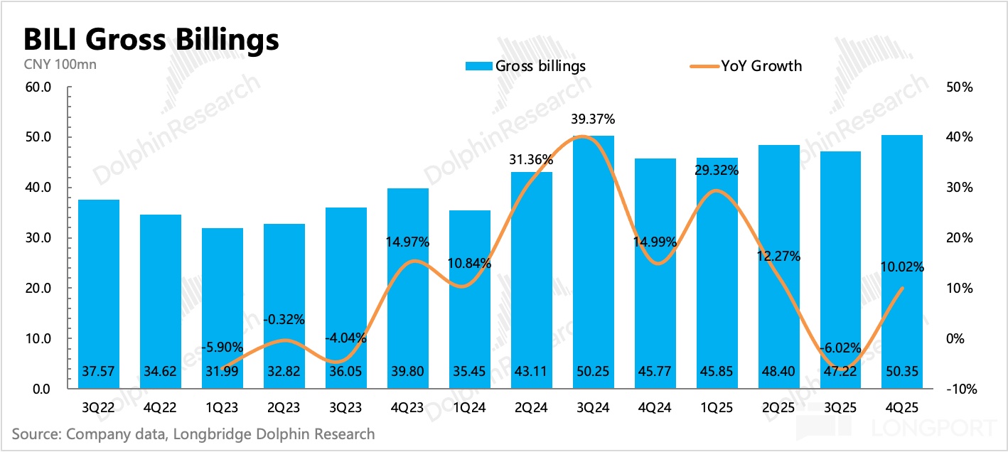 1. 廣告高增長,趨勢有望繼續:Q4 廣告增長 27%,小幅超出市場預期。海豚君認為,背後驅動除了本身生態在良性增長外(用户、up 主內容創作均在正常增長),也有公司主觀的努力(提高廣告加載率、改善廣告效率、AIGC 廣告生成工具等),和環境順風(短劇、小遊戲、AI 等內容產品,天然適配 B 站平台用户標籤)。