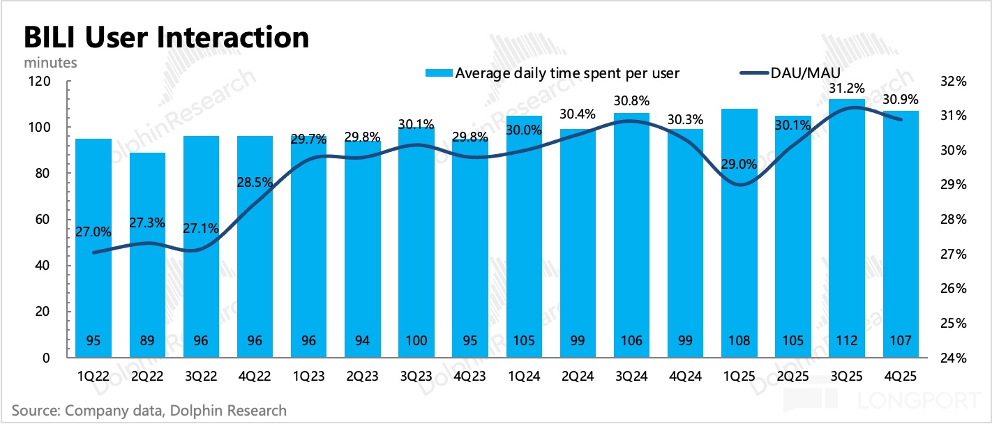 四季度是泛娛樂相對淡季,B 站用户 MAU 季節性減少了 1000 萬人。粘性指標則繼續同比改善,DAU/MAU 環比提升至 30.9%,用户時長達到 107 分鐘創紀錄,同比增加 8 分鐘。