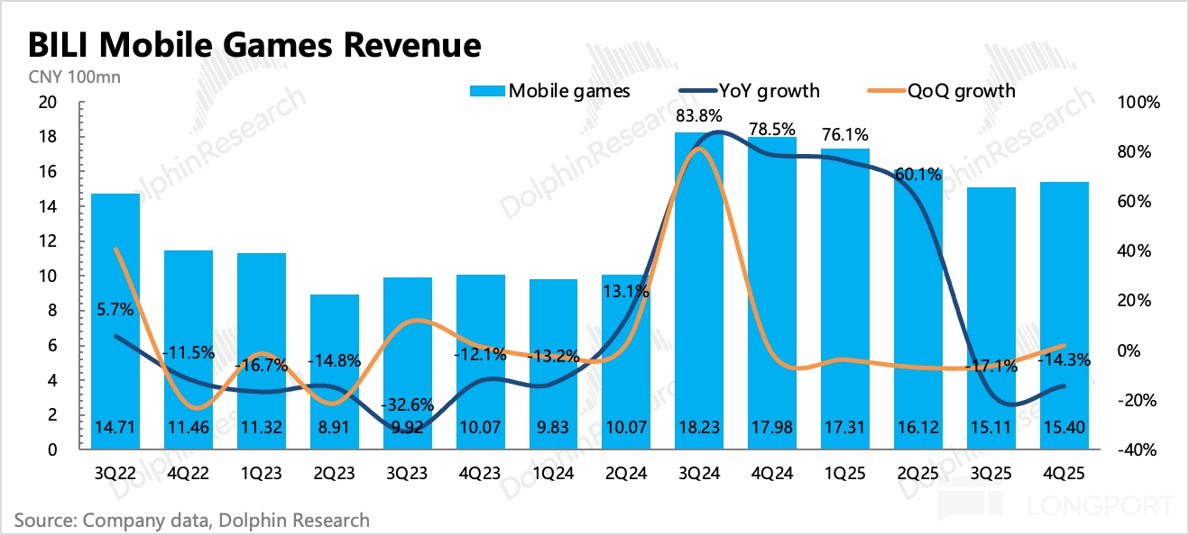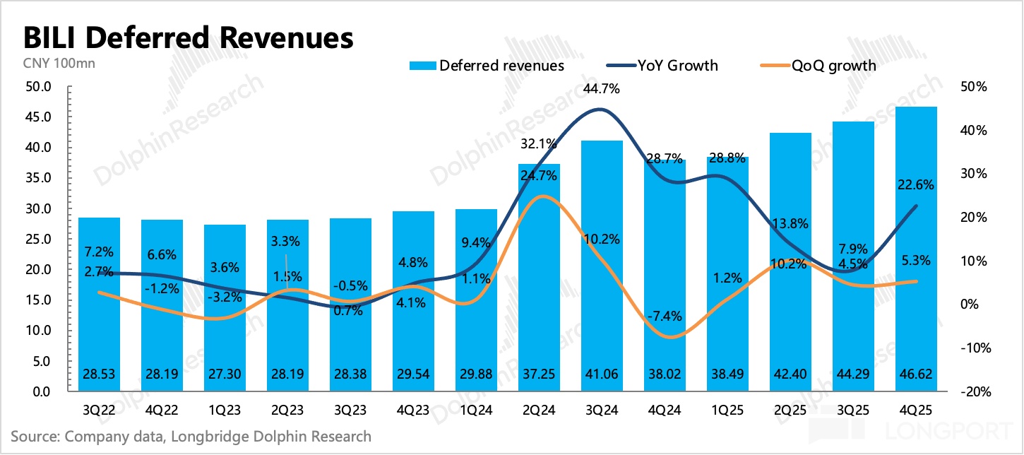 Q4 末遞延收入同比增速 23%,環比也有小幅增長,這在淡季並不算常態。將 VAS 增值服務和遊戲加總看整體內容消費,計算得 Q4 流水環比增長了 7%。已知 VAS 表現一般,大會員環比淨減少(整個長視頻行業都不行),因此除了可能的付費視頻內容增加外,就主要體現的是遊戲增量了。