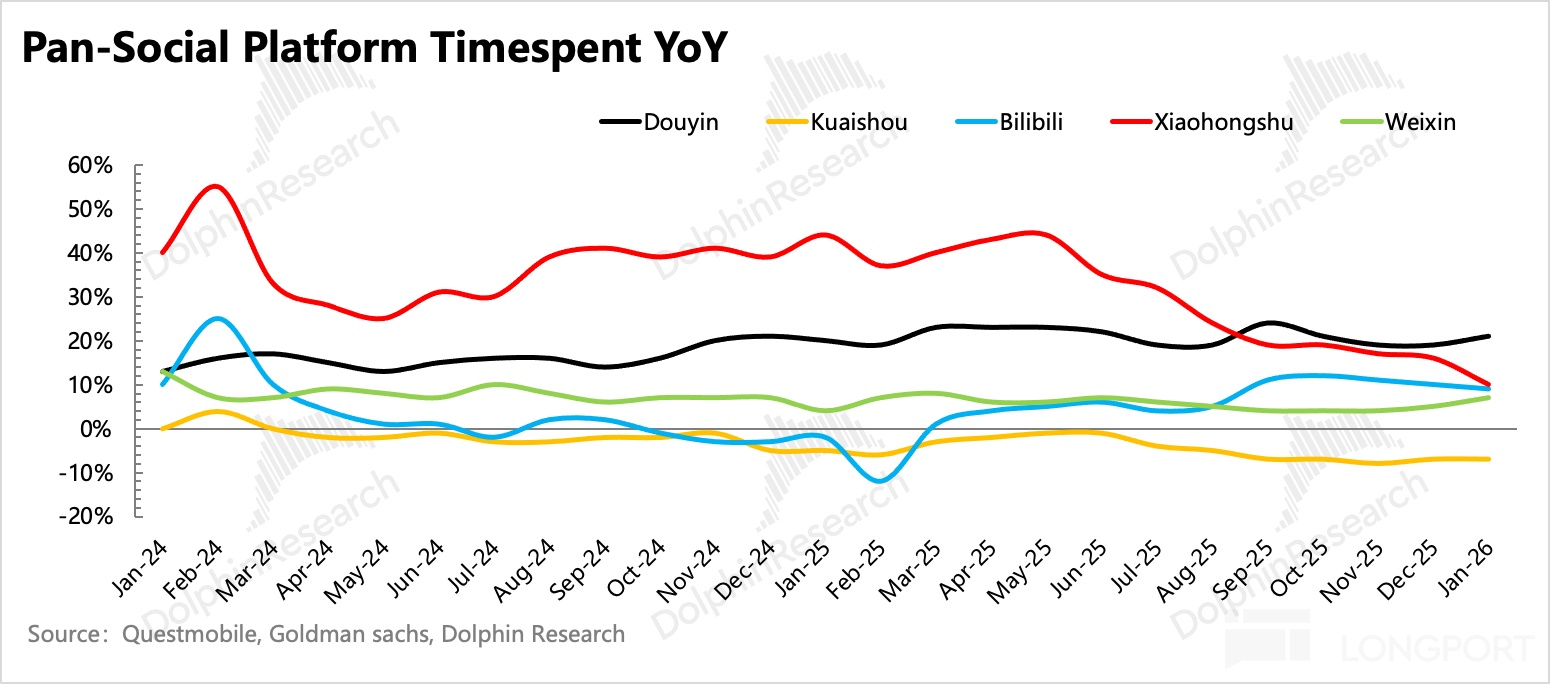但去年以來,“用户生態的改善” 是 B 站幾個季度財報均有體現,也是海豚君看好 B 站仍有中長期發展潛力的原因。尤其是在此期間,字節系在 AI 催化下生態時長繼續高歌猛進,小紅書勢頭雖有放緩但仍不低下,B 站是其他存量中為數不多的時長正增長的平台。